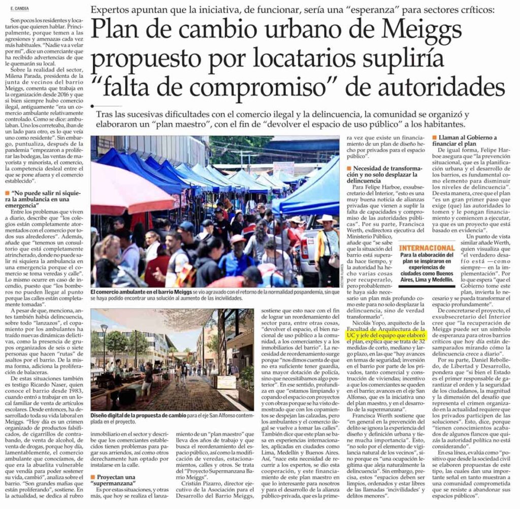 El Mercurio destaca que hoy se realiza el lanzamiento del “Proyecto Supermanzana Barrio Meiggs”, plan propuesto por locatarios que busca el reordenamiento del espacio público, así como la modificación de veredas, estacionamientos, calles y otros. Habla el arquitecto de la Dirección de Servicios Externos de la Facultad, Nicolás Yopo.