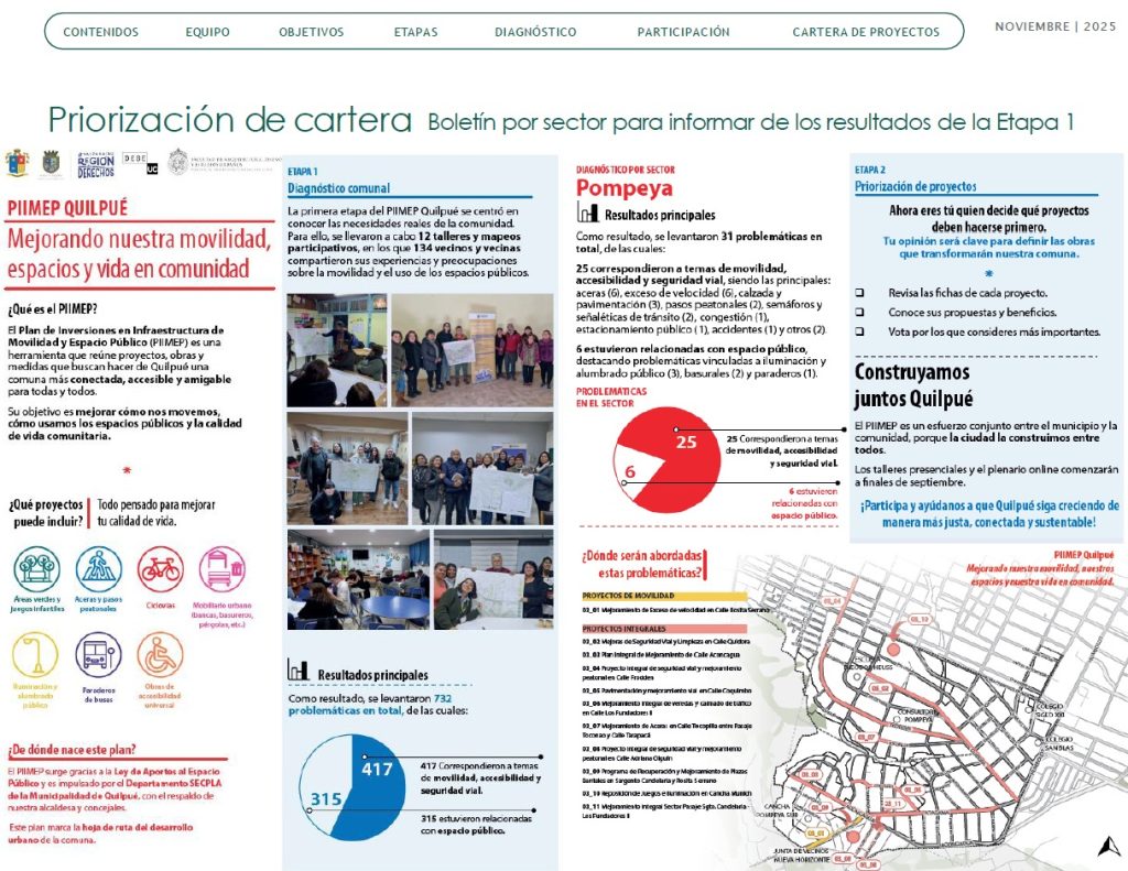 “El trabajo de la DESE caracterizó un análisis técnico riguroso acompañado de la participación activa de la comunidad a través de 12 talleres y una consulta digital, que reunió cientos de comentarios y prioridades de los vecinos para la primera etapa;” destacó Moreno, enfatizando que “con el PIIMEP, quedamos en condiciones de avanzar hacia un Quilpué más conectado, accesible y sustentable, alineado con las expectativas y necesidades de su población.”
